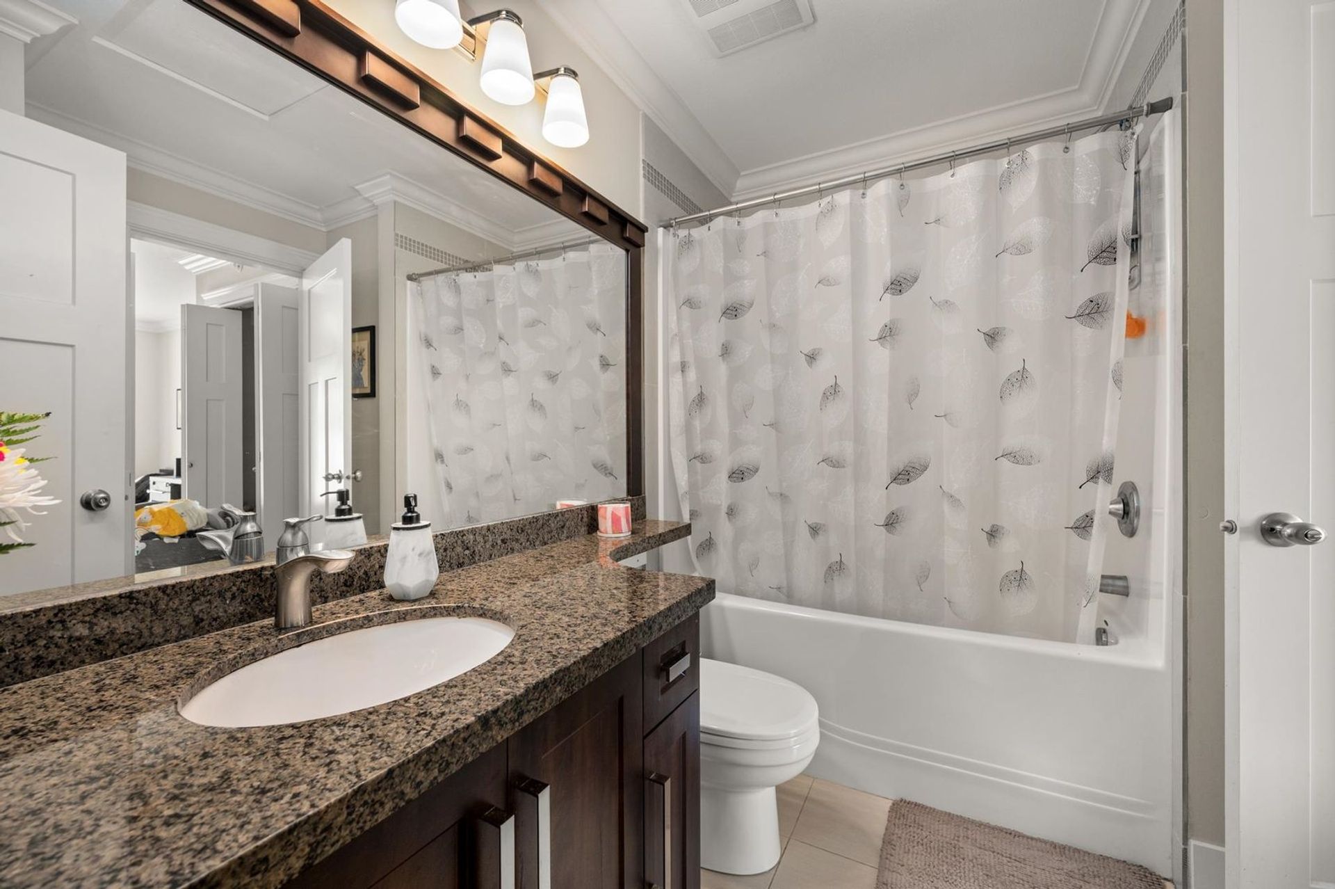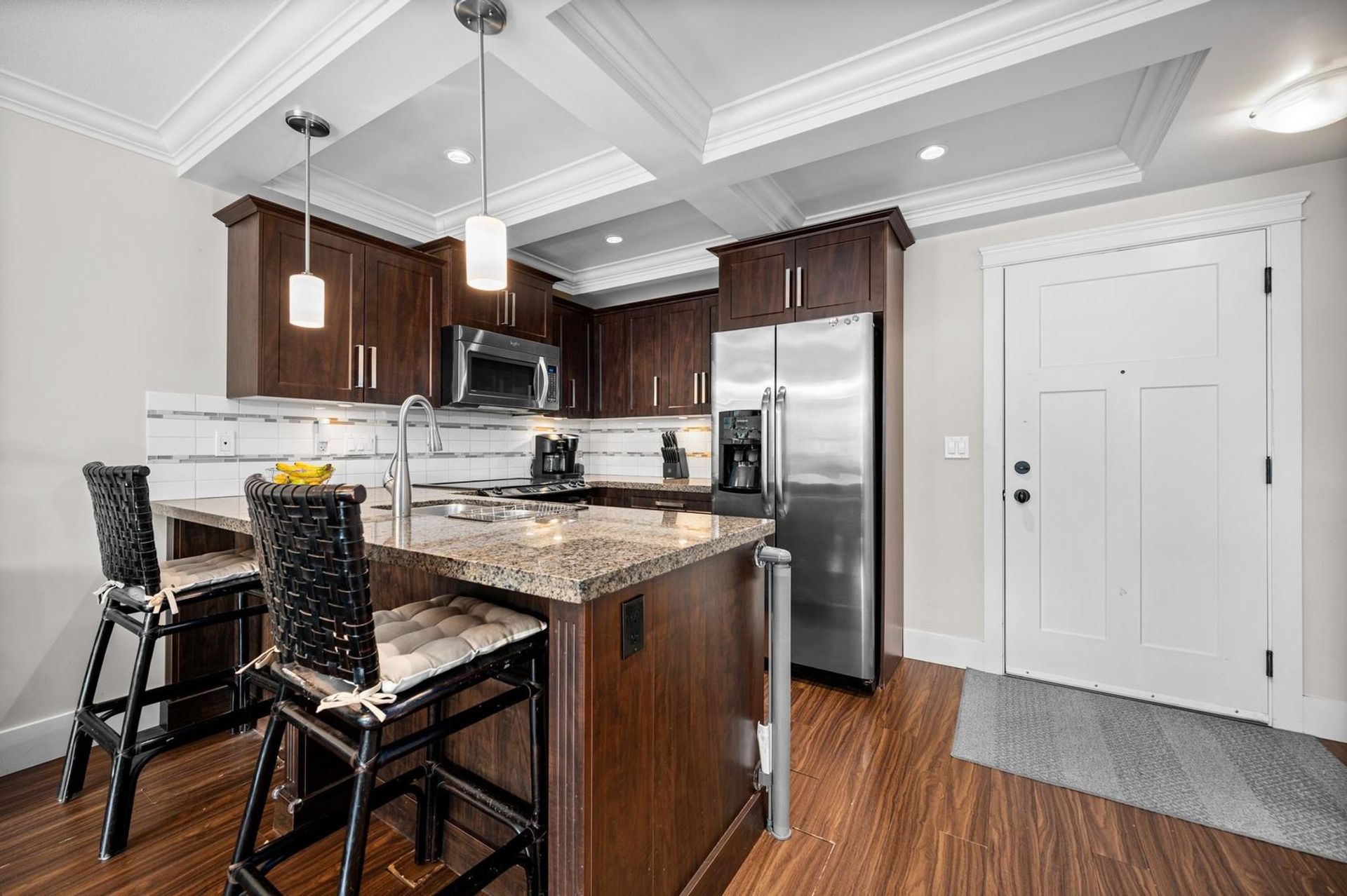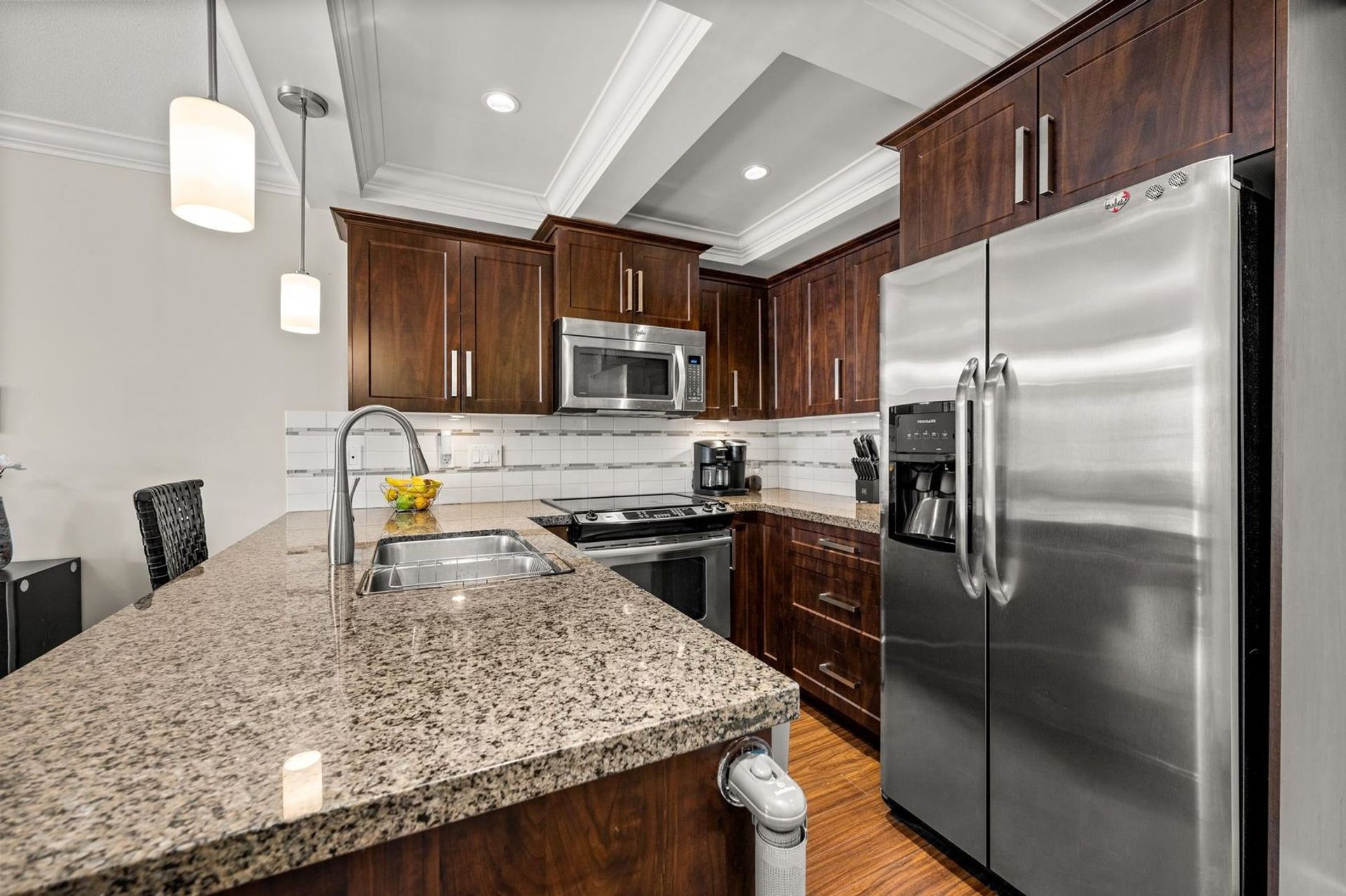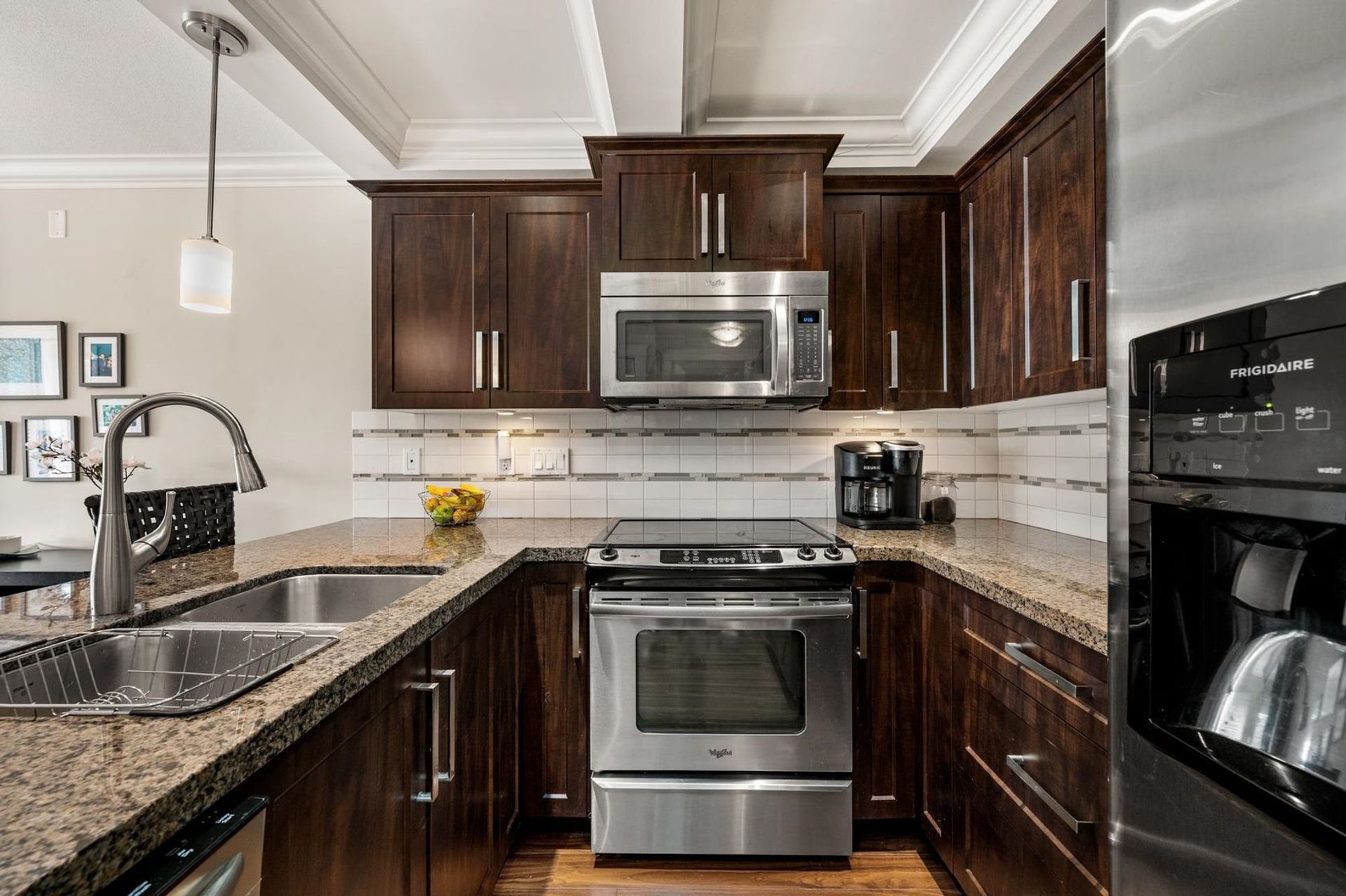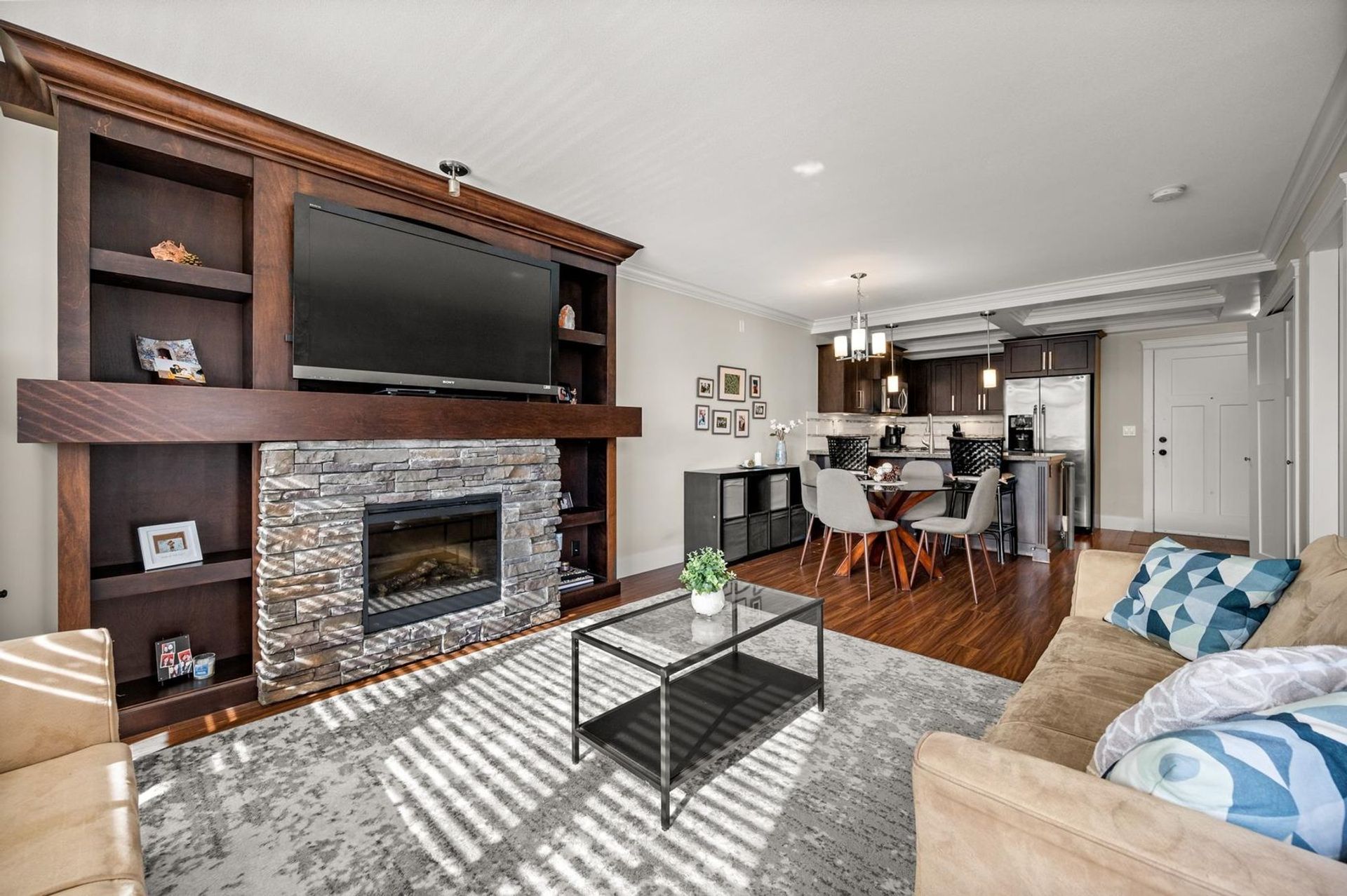 Welcome to The Residences on Shaughnessy. This 1 bed + 1 bath south facing TOP FLOOR 667 sqft home is not one to miss! The kitchen features stainless steel appliances, granite countertops, a breakfast bar & is open to the dining & living room area - perfect for entertaining. Enjoy the host of details including crown mouldings throughout, coffered ceiling detail, stone work around the fireplace & built in entertainment unit. Tons of natural light from the large windows & south facing exposure! The large bedroom features dual closets w/ cheater access to the bathroom. Great location! Steps to transit, shopping, grocery, parks, downtown POCO & a quick 5 minute drive to the Evergreen Line station. This home features 1 parking and 1 locker. Don't miss your opportunity to call this place home.