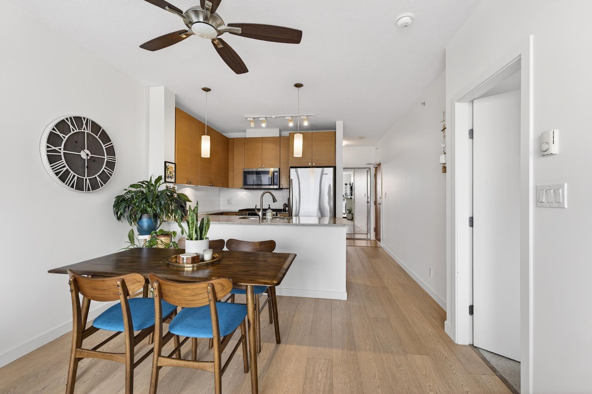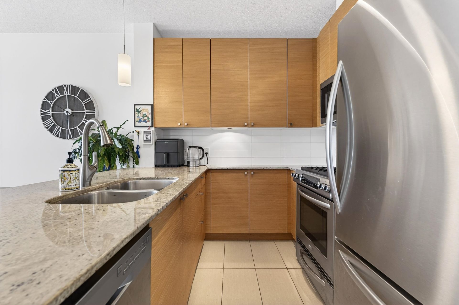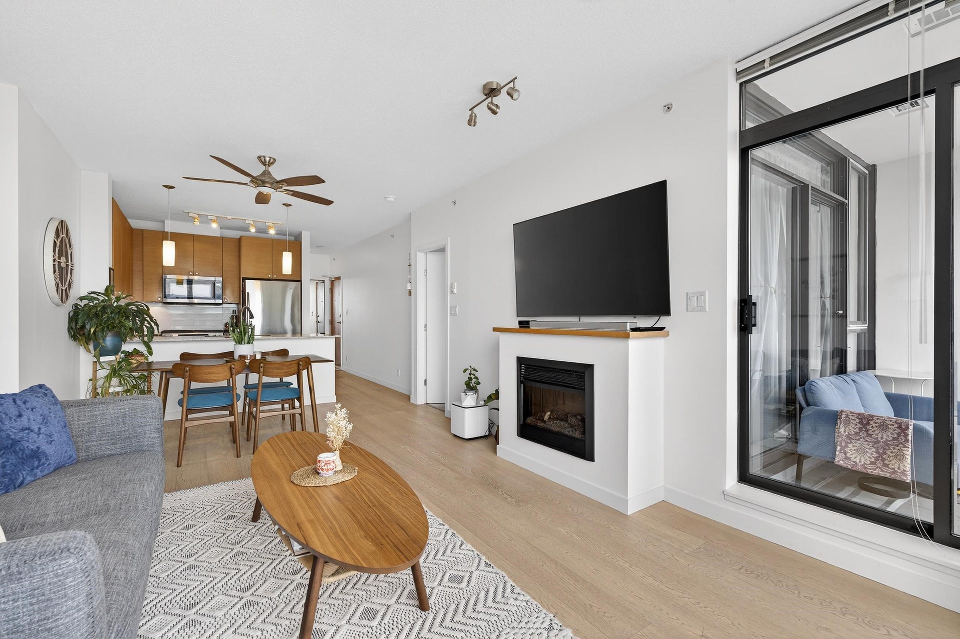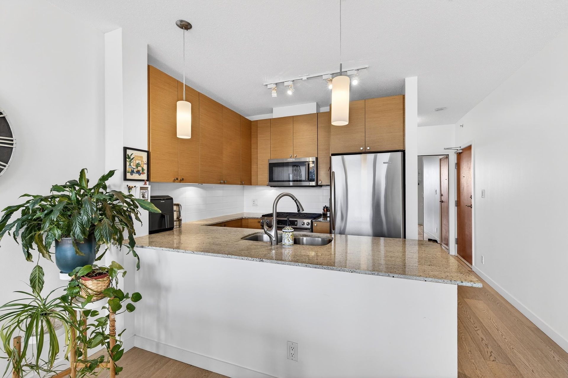 Welcome to Aria 1 in sought-after Suter Brook Village! This bright and spacious 1 bed, 1 bath condo features floor-to-ceiling windows, updated floors, fresh paint, and an open living/dining area - perfect for entertaining. Relax on your balcony and take in the unobstructed views of the mountains. The kitchen offers granite countertops, stainless steel appliances, gas range, built-in microwave, and breakfast bar. Enjoy resort-style amenities including an indoor pool, hot tub, sauna, steam room, fully equipped gym, squash court, yoga studio, theatre, and party room. Unbeatable location just steps to shops, restaurants, Thrifty Foods, Starbucks, JJ Bean, SkyTrain, Rocky Point Park, and Brewers Row. Book your private showing today!